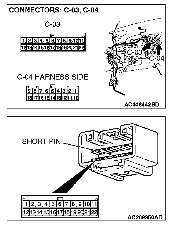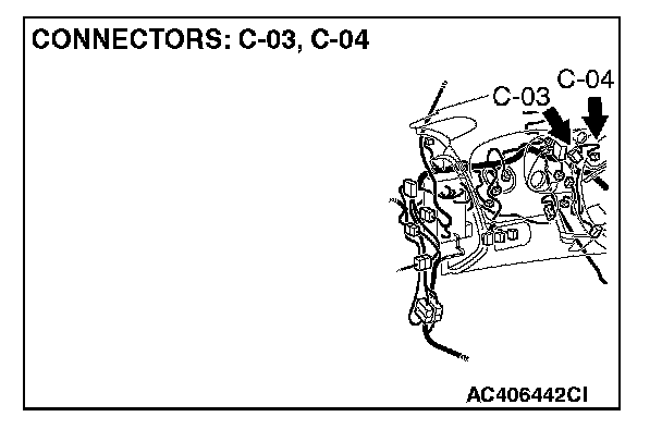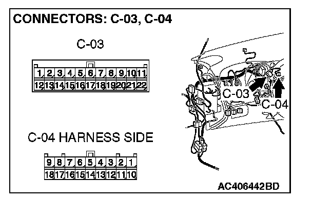 STEP 1. Check joint connector (3) C-03 and combination meter connector C-04 for loose, corroded or damaged terminals, or terminals pushed back in the connector.