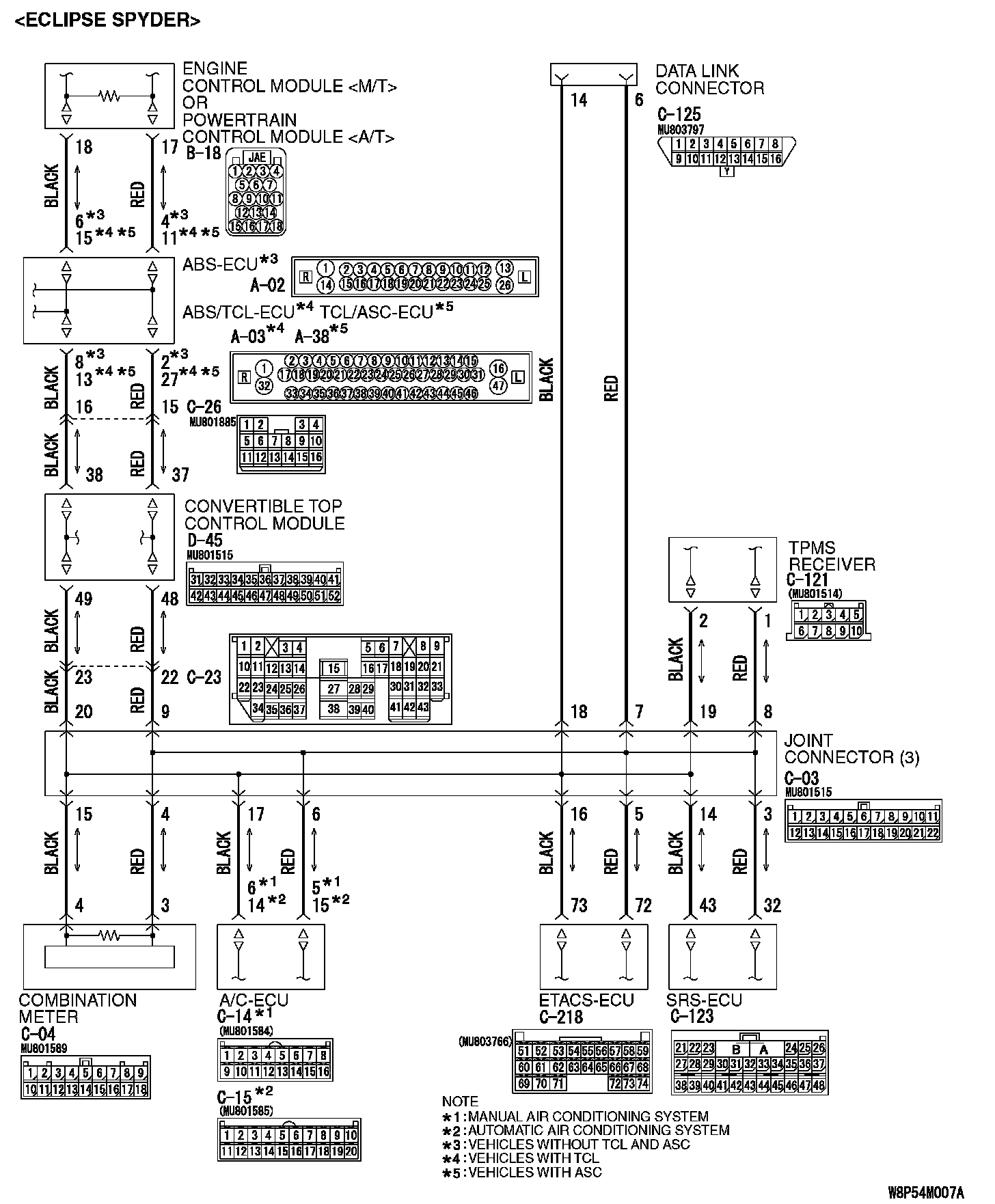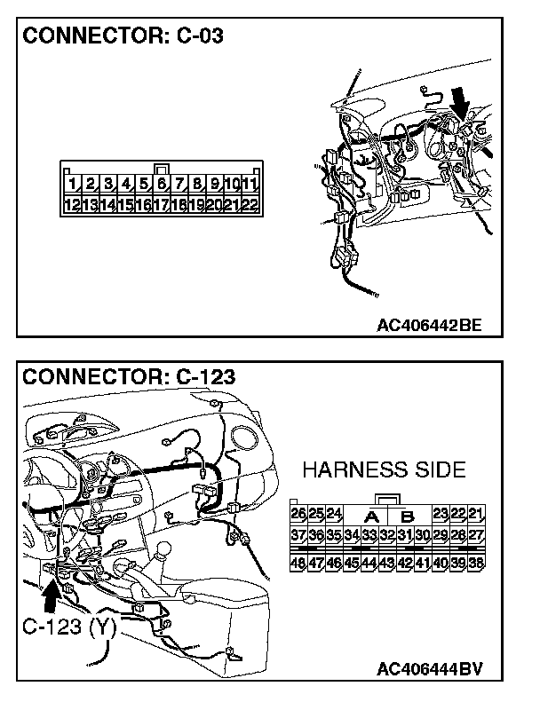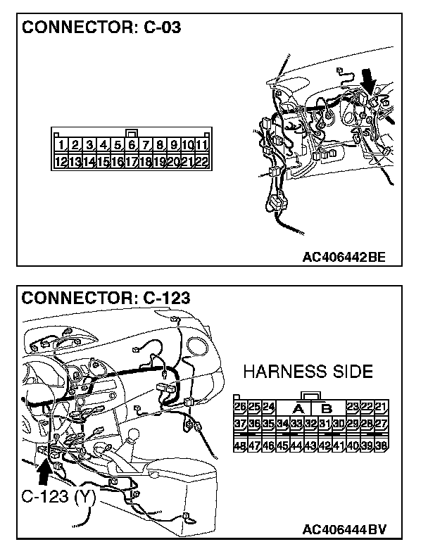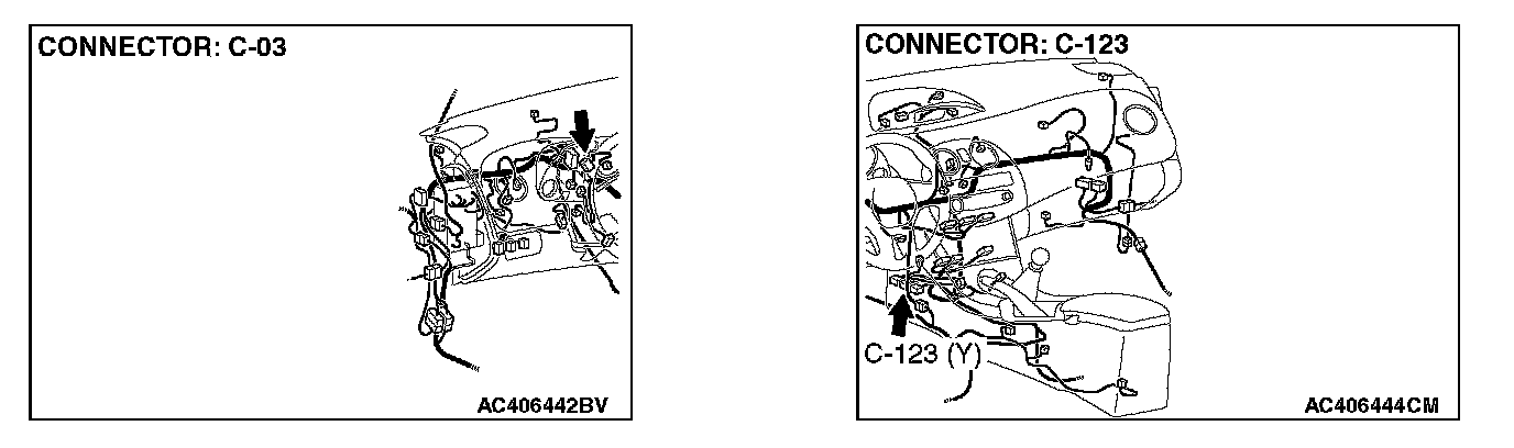 STEP 1. Check joint connector (3) C-03 and SRS-ECU connector C-123 for loose, corroded or damaged terminals, or terminals pushed back in the connector.