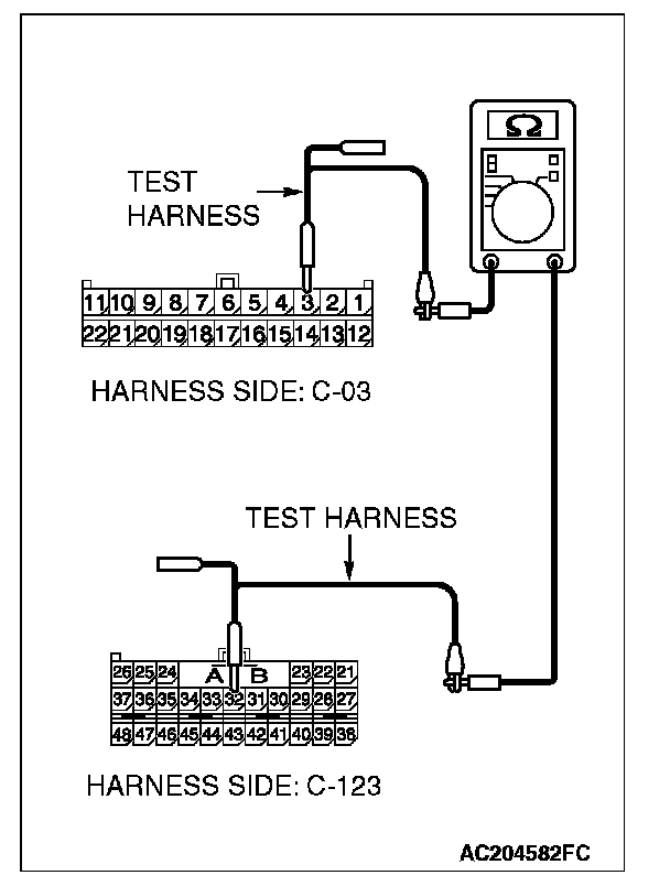2. Disconnect joint connector (3) C-03 and SRS-ECU connector C-123, and measure the resistance between the wiring harness side connector of SRS-ECU connector C-123 and joint connector (3) C-03.