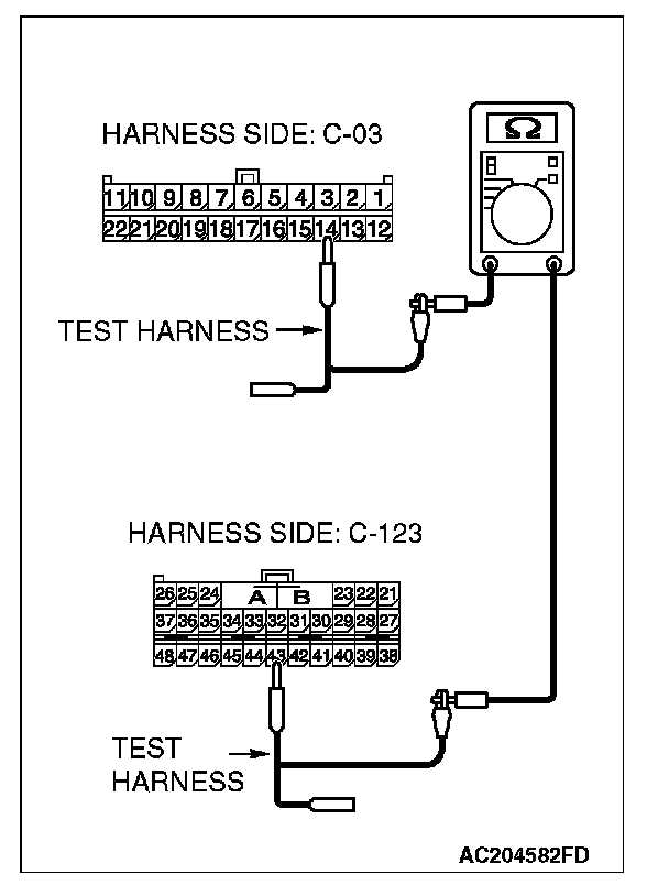 4. Measure the resistance between joint connector (3) C-03 (terminal 14) and SRS-ECU connector C-123 (terminal 43).