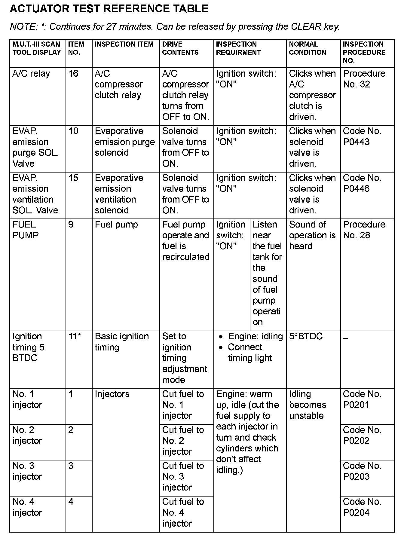 Actuator Test Reference Table (Part 1):