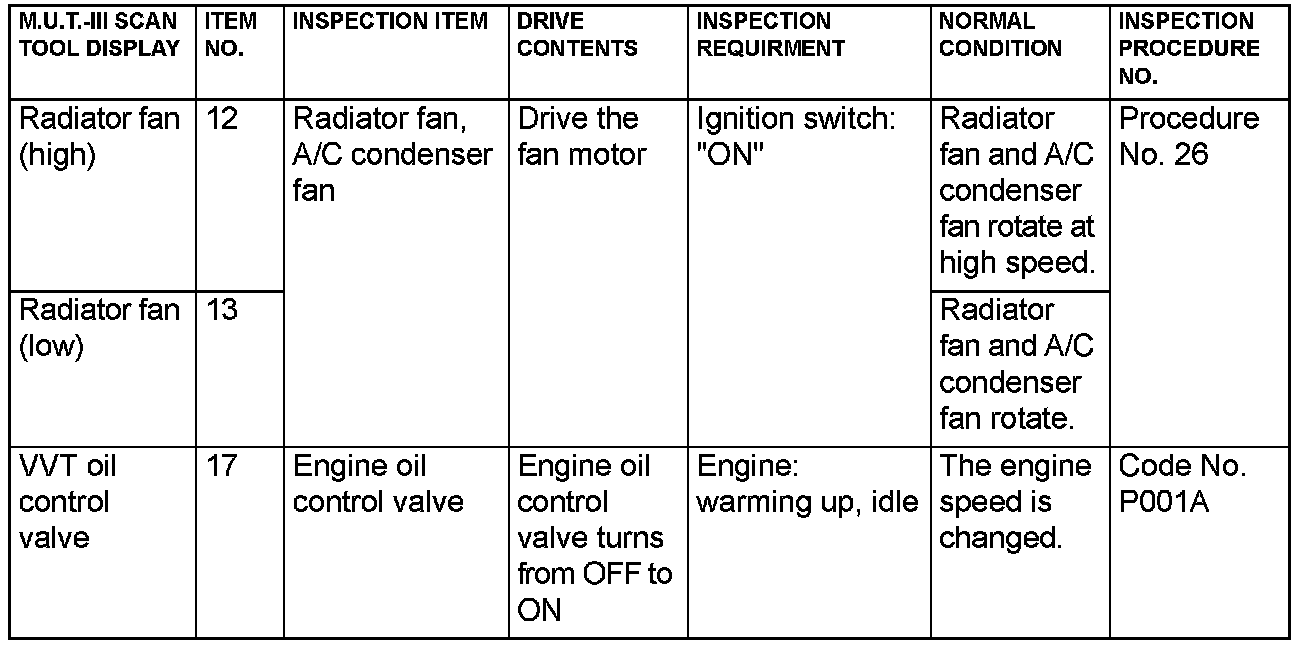 Actuator Test Reference Table