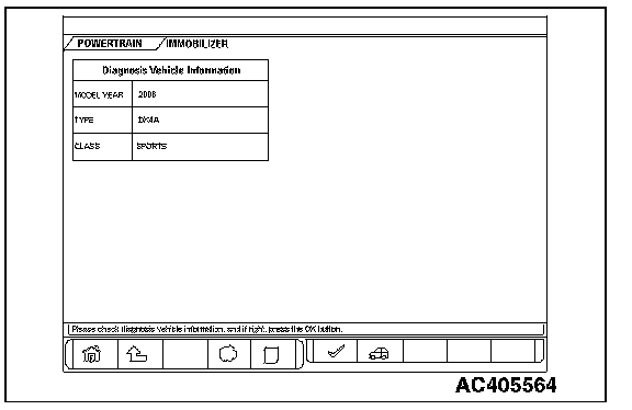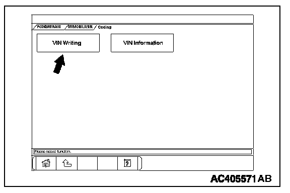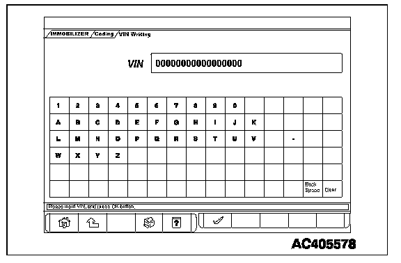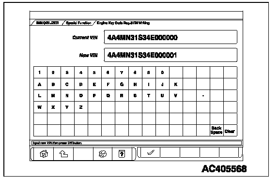 HOW TO PERFORM VEHICLE IDENTIFICATION NUMBER (VIN) WRITINGThe Vehicle Identification Number (VIN) is stored in the ECM or PCM by the vehicle manufacture. If the VIN to be stored in the ECM or PCM is eliminated fraudulently, the Malfunction Indicator Lamp (SERVICE ENGINE SOON or Check Engine Lamp) illuminates and Diagnostic Trouble Code (DTC) No. P0630 (VIN malfunction) is shown. When the ECM or PCM is replaced, and entry of the VIN necessary due to DTC No. P0630 (VIN malfunction). Enter the VIN in accordance with the procedure as follows: