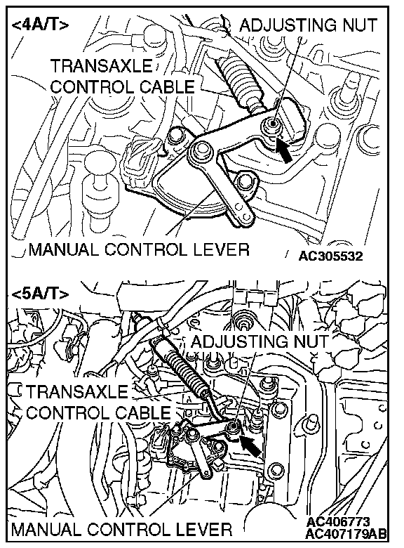 6. Gently push the transaxle control cable in the direction of the arrow, until the cable is taut. Tighten the adjusting nut.