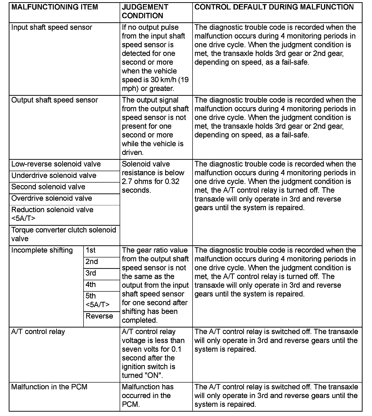 When a malfunction of a main sensor or actuator is detected by the PCM, the transaxle is controlled by pre-set control logic to maintain safe conditions for driving.