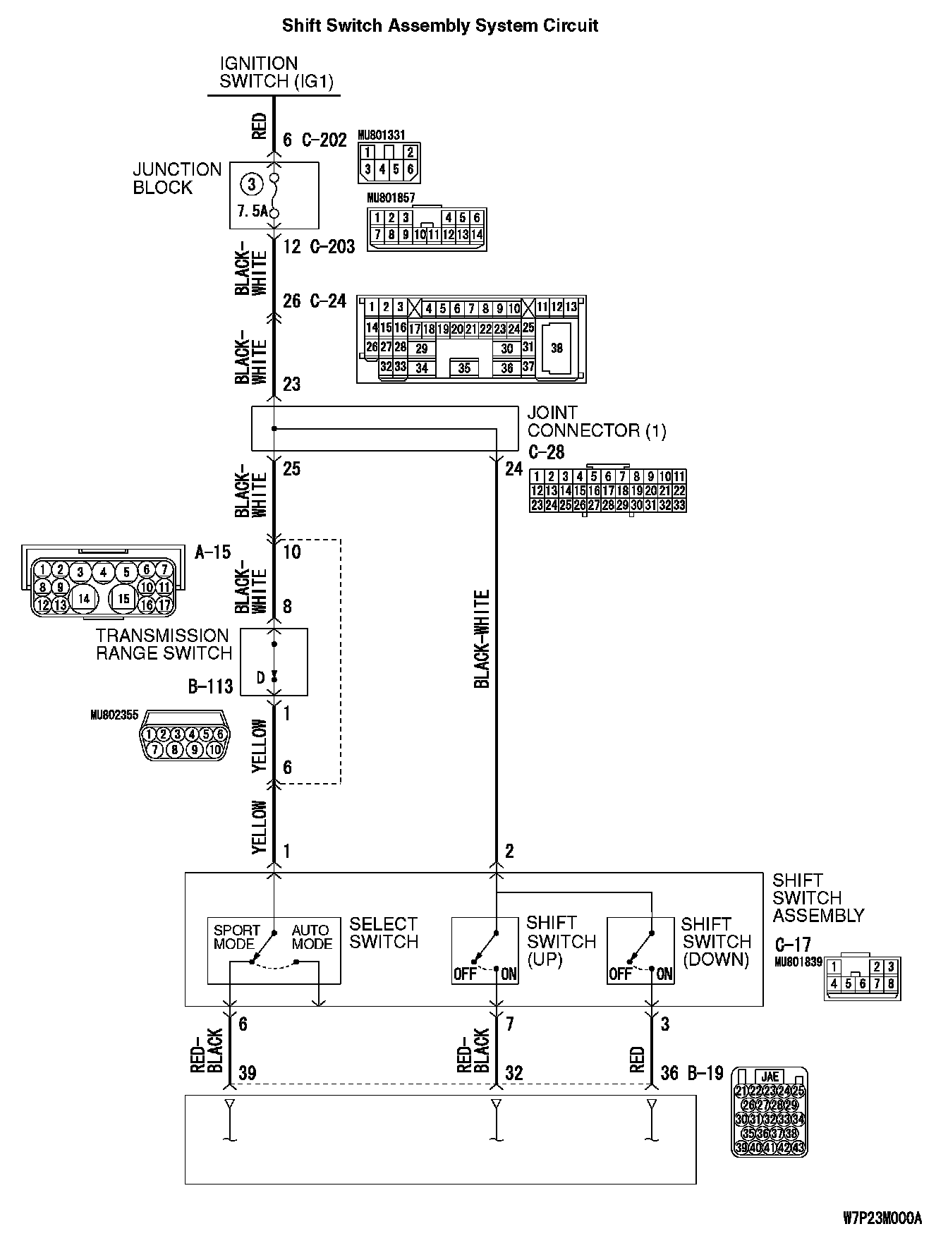 If the select switch of the shift switch assembly is set to the sport mode, battery positive voltage will be applied to the PCM (terminal 39). If the shift switch of the shift switch assembly is set to "UP" or "DOWN" position, battery positive voltage will be applied to the PCM (terminal 32, 36).