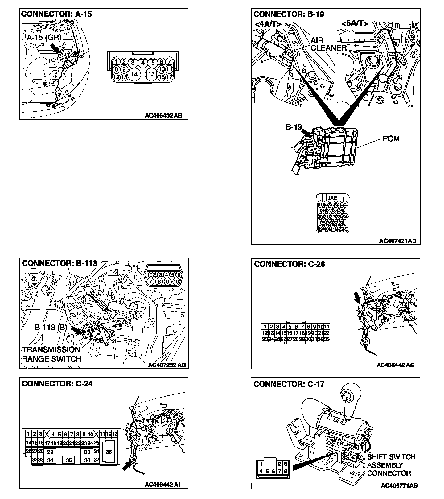 STEP 3. Check PCM connector B-19 and shift switch assembly connector C-17 for loose, corroded or damaged terminals, or terminals pushed back in the connector.