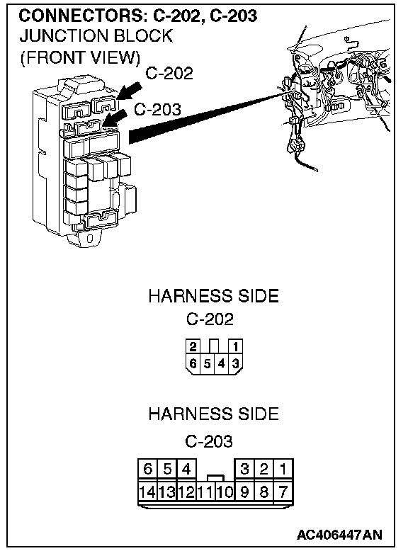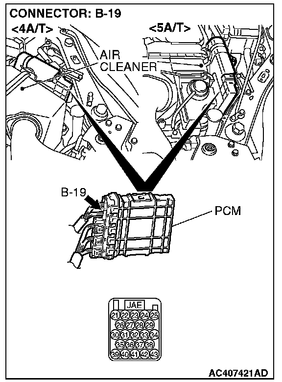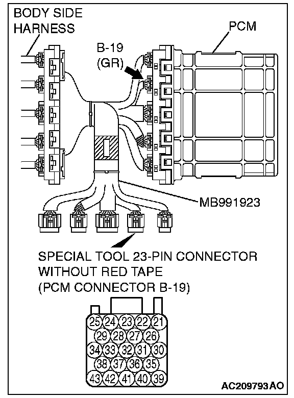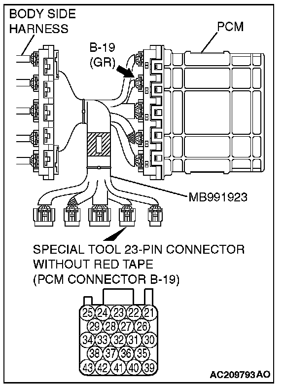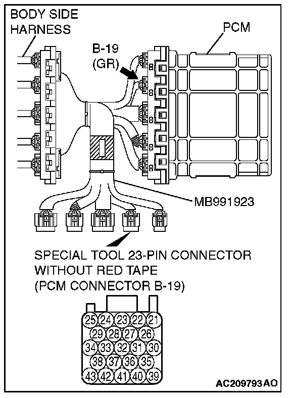 2) Connect special tool MB991923 (check harness) between the PCM and the body-side harness connector.