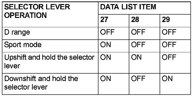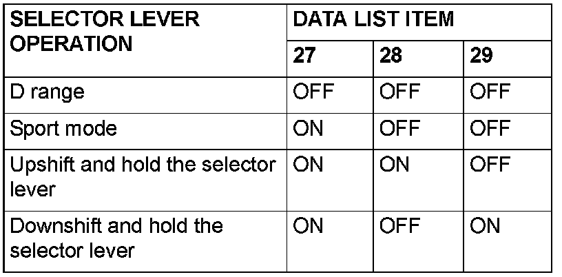 STEP 4. Using scan tool MB991958, check data list item 27: Select Switch, item 28: Shift Switch (Up), item 29: Shift Switch (Down).