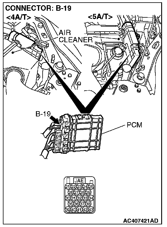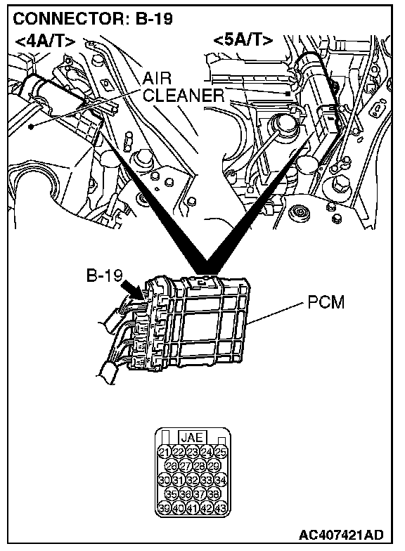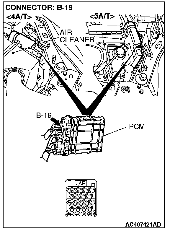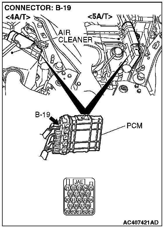 STEP 21. Check PCM connector B-19 for loose, corroded or damaged terminals, or terminals pushed back in the connector.