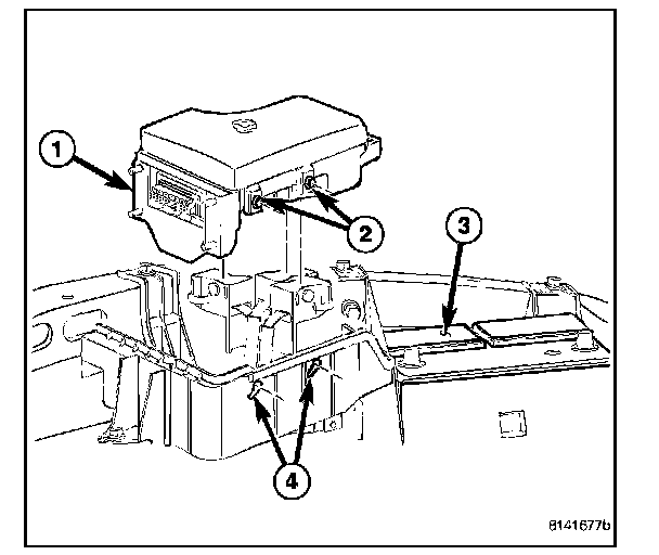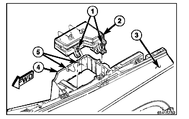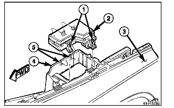 5. Move the IPM (1) forward and up to disengage the locking tabs (2) from the battery tray locating slots (4).