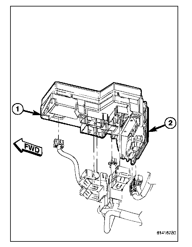 6. Lift the IPM up to access and disconnect the wiring harness connectors from the Power Distribution Center (1) and Front Control Module 2).
