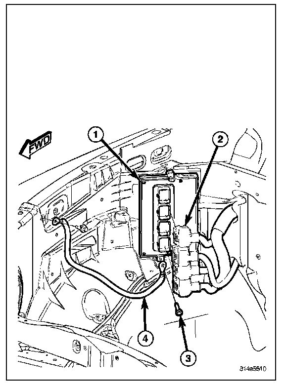 4. Be sure ground strap (4) is secured both at bottom of PCM, and at inner-fender.
