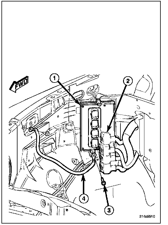The Transmission Control Module (TCM) is a sub-module within the Powertrain Control Module (PCM) (1). The PCM is attached to the right-inner corner of the engine compartment.