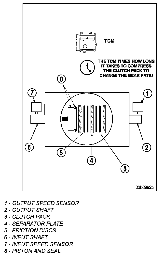 For example, if the input shaft is rotating at 1000 rpm and the output shaft is rotating at 500 rpm, then the TCM can determine that the gear ratio is 2:1. In direct drive (3rd gear), the gear ratio changes to 1:1. The gear ratio changes as clutches are applied and released. By monitoring the length of time it takes for the gear ratio to change following a shift request, the TCM can determine the volume of fluid used to apply or release a friction element.