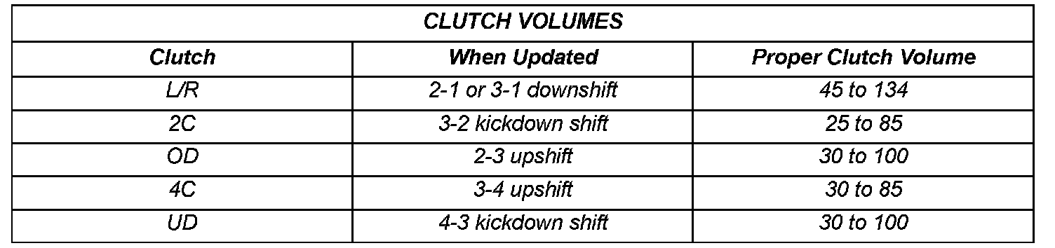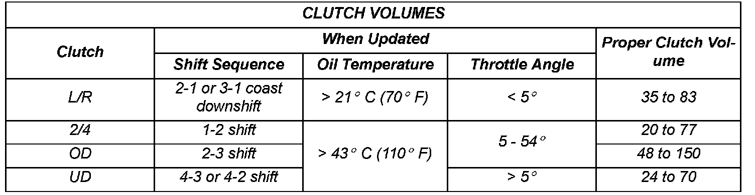 Certain mechanical problems within the input clutch assembly can cause inadequate or out-of-range element volumes. Also, defective Input/Output Speed Sensors and wiring can cause these conditions. The following charts identifies the appropriate clutch volumes and when they are monitored/updated: