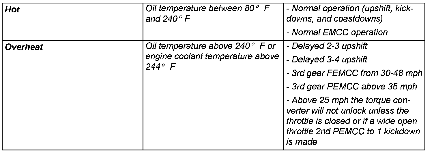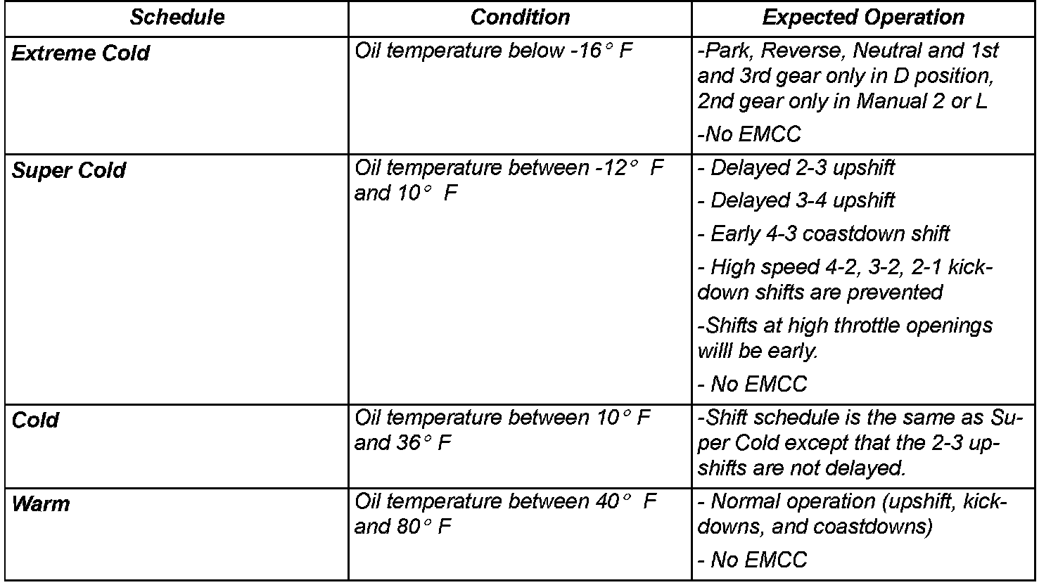 As driving conditions change, the TCM appropriately adjusts the shift schedule. Refer to the following chart to determine the appropriate operation expected, depending on driving conditions.
