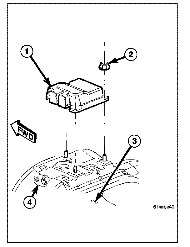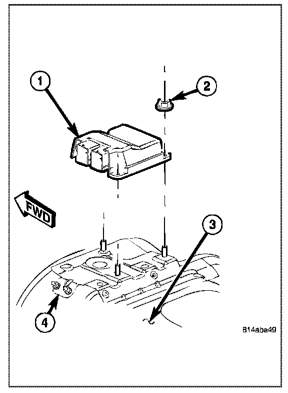 1. Carefully position the Occupant Restraint Controller (ORC) (1) onto the studs of the ORC mount (4) on the floor panel transmission tunnel. When the ORC is correctly positioned, the arrow on the ORC label will be pointed forward in the vehicle and the ORC connector receptacles will be facing the left side of the vehicle.
