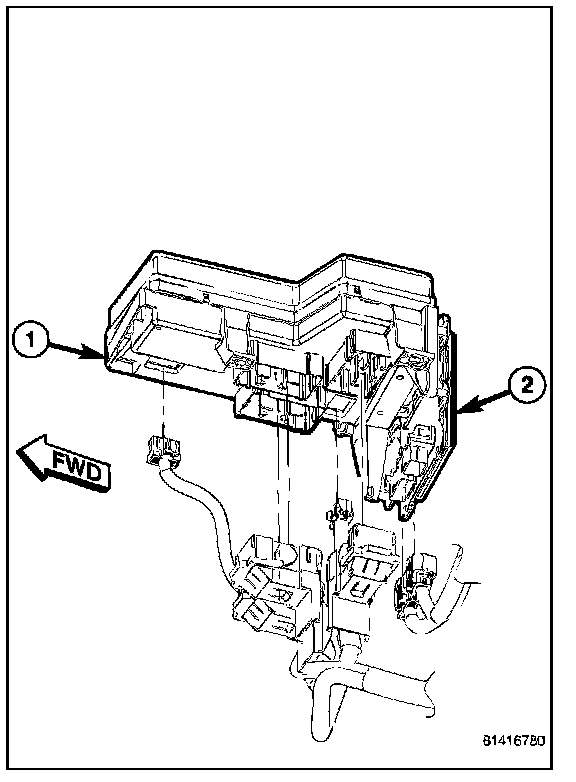 The Integrated Power Module (IPM) is a combination of the Power Distribution Center (PDC) (1) and the Front Control Module (FCM) (2). The PDC mates directly with the FCM to form the IPM. The PDC is a printed circuit board based module that contains fuses and relays, while the FCM contains the electronics controlling the IPM and other functions. The IPM connects directly to the battery positive via a stud located on top of the unit. The ground connection is via electrical connectors. The IPM provides the primary means of voltage distribution and protection for the entire vehicle.
