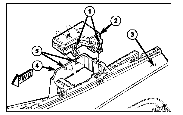 The IPM (2) is located in the engine compartment, next to the battery. It is secured to the battery tray (4) with two locating slots (5) and two pushpin style fasteners (1). The PDC portion of the IPM cannot be repaired and must be replaced if inoperative or damaged.
