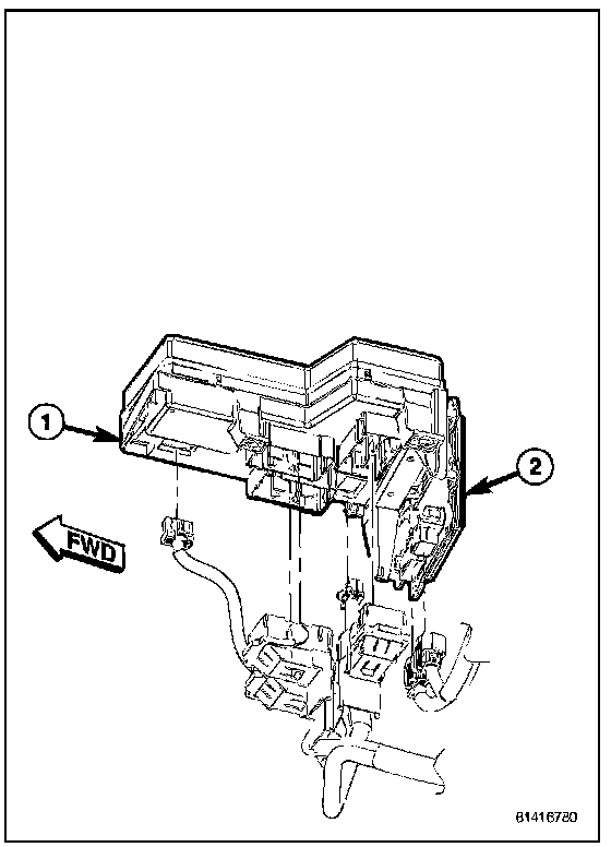 The Front Control Module (FCM) (2) contains the software to control the electric shift transfer cases in this vehicle. A separate Transfer Case Control Module (TCCM) is not used. The FCM is a microprocessor-based assembly, controlling the 4X4 transfer case shift functions via the actuation of a shift motor and utilizing the feedback of a mode sensor assembly. Communication is via the CAN bus. Inputs include user selectable 4X4 modes that include 2WD, AWD, 4LOCK, 4LO, and Neutral, depending on the transfer case.