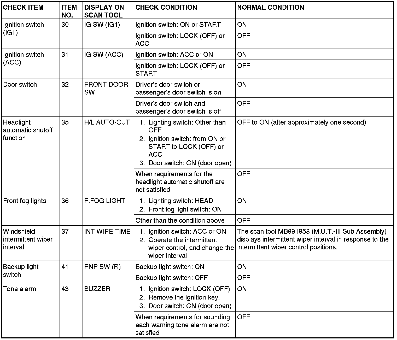 For item No.43, the scan tool MB991958 (M.U.T.-III Sub Assembly) also displays "ON" when the light reminder tone alarm or the seat belt tone alarm function is triggered.