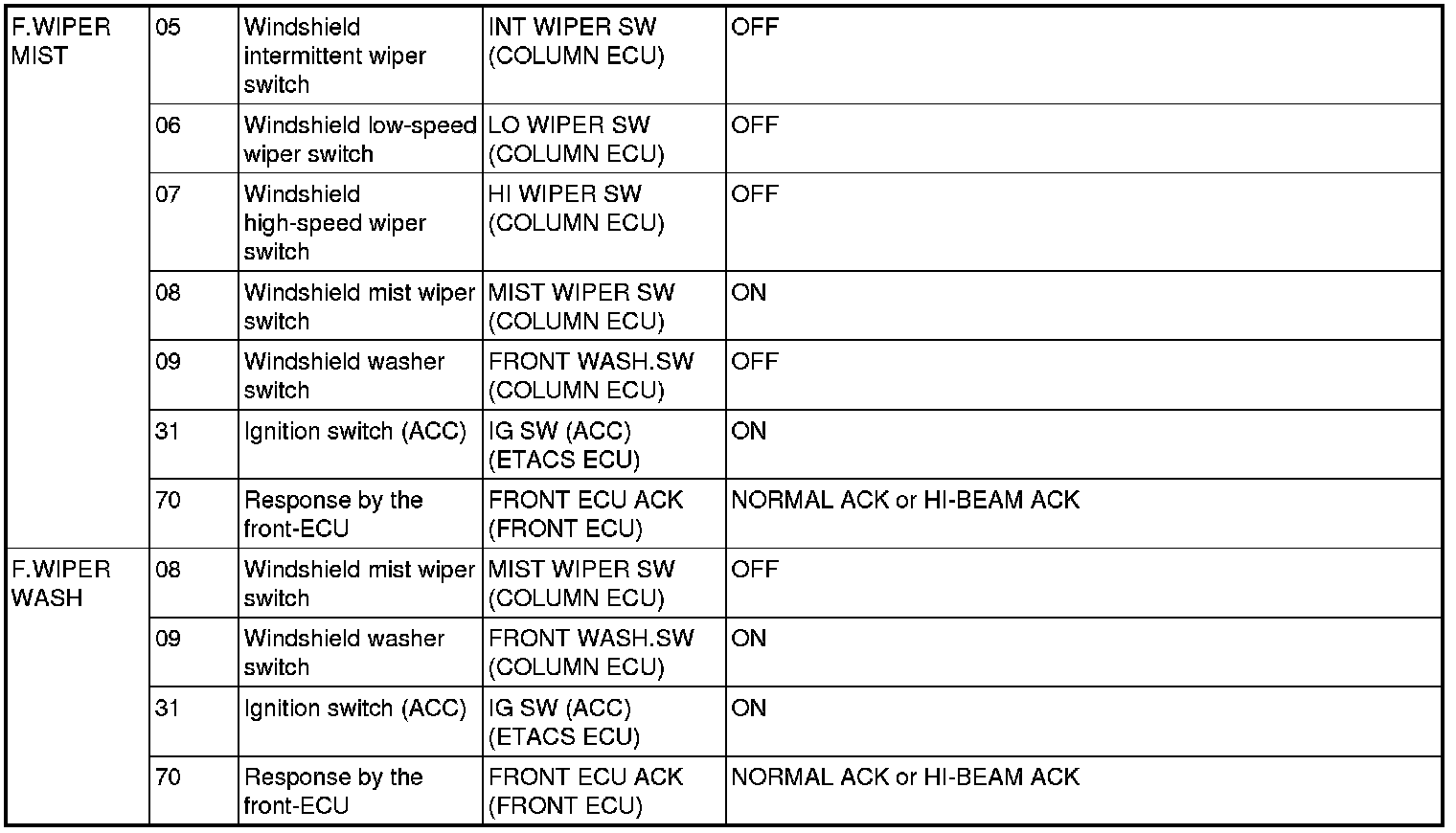 For item No.70, the scan tool MB991958 (M.U.T.-III Sub Assembly) also displays "NG" under "ECU COMM Check" when it displays "NO ACK" under the front-ECU check.