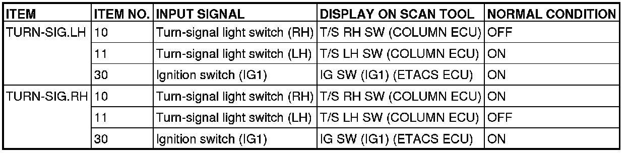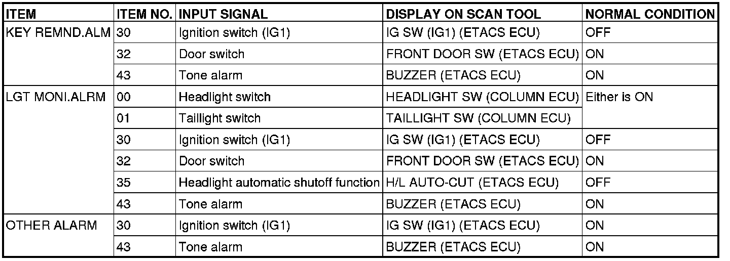 When checking the input signals (off, tail, low-beam or high-beam), turn the ignition switch to the "ON" position in order to disable the headlight automatic shutoff function. However, since the headlight operation does not depend on the ignition switch positions, the scan tool MB991958 (M.U.T.-III Sub Assembly) does not display the title "IGNITION SWITCH".