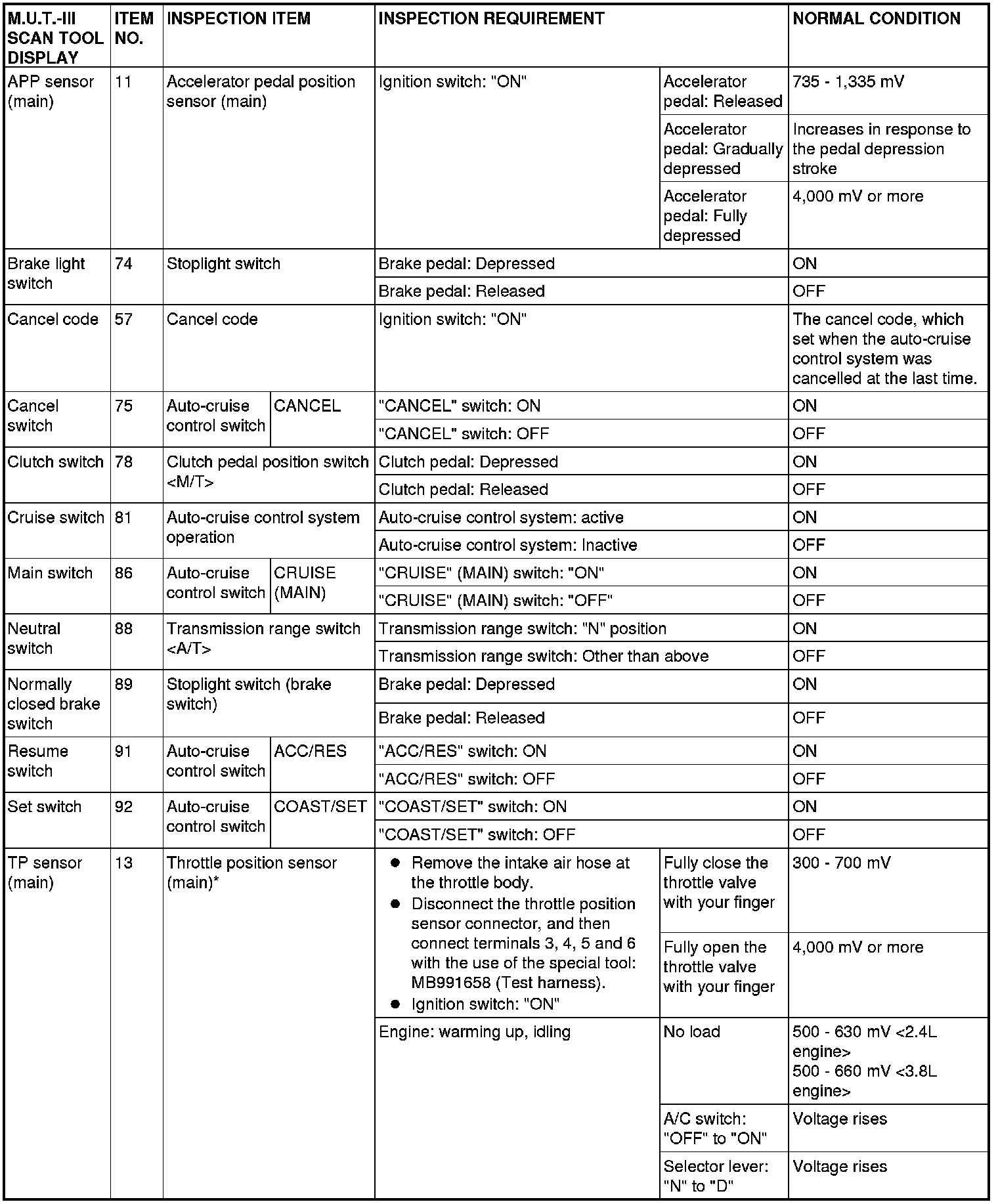*:After the inspection is completed, disconnect the throttle position sensor connector, and then delete the diagnostic trouble code using scan tool MB991958. (Refer to Reading and Clearing Diagnostic Trouble Codes).