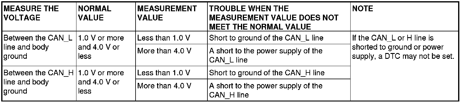 Diagnoses the power supply (such as wires of higher voltage than CAN communication line) and grounding (such as wires of lower voltage than CAN communication line) of CAN bus lines for short circuit by measuring the voltages between the CAN_L line or H line and body ground.