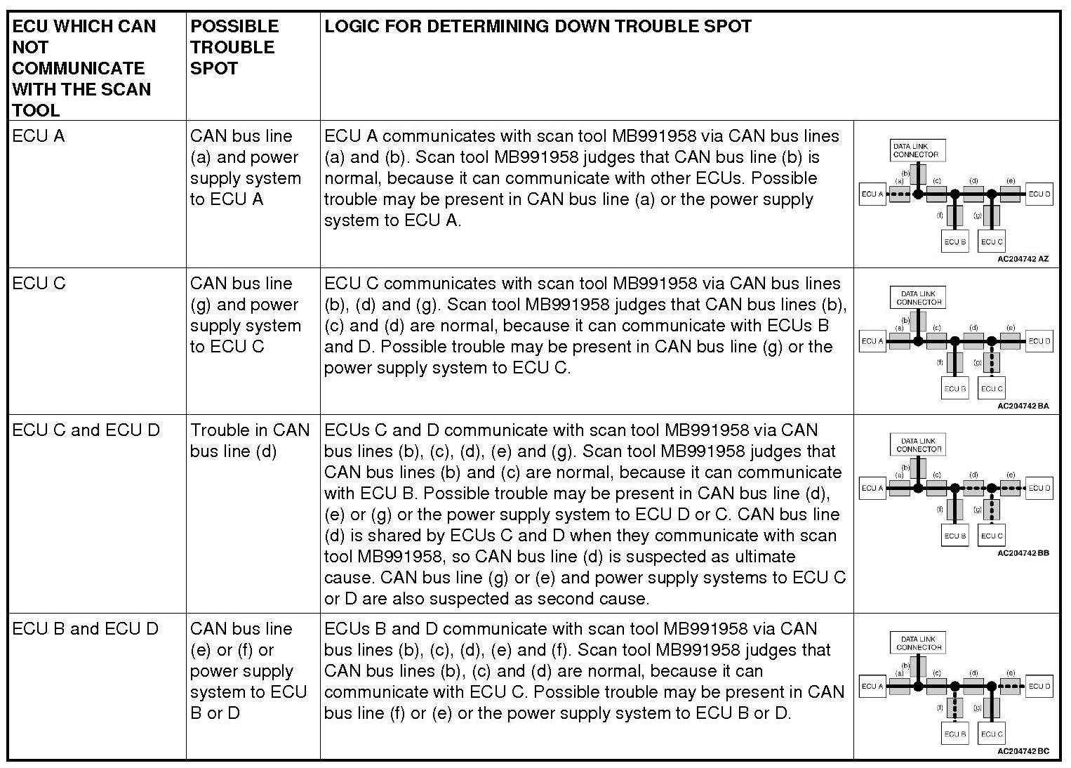 Scan tool MB991958 diagnoses CAN bus lines in accordance with the following strategy.