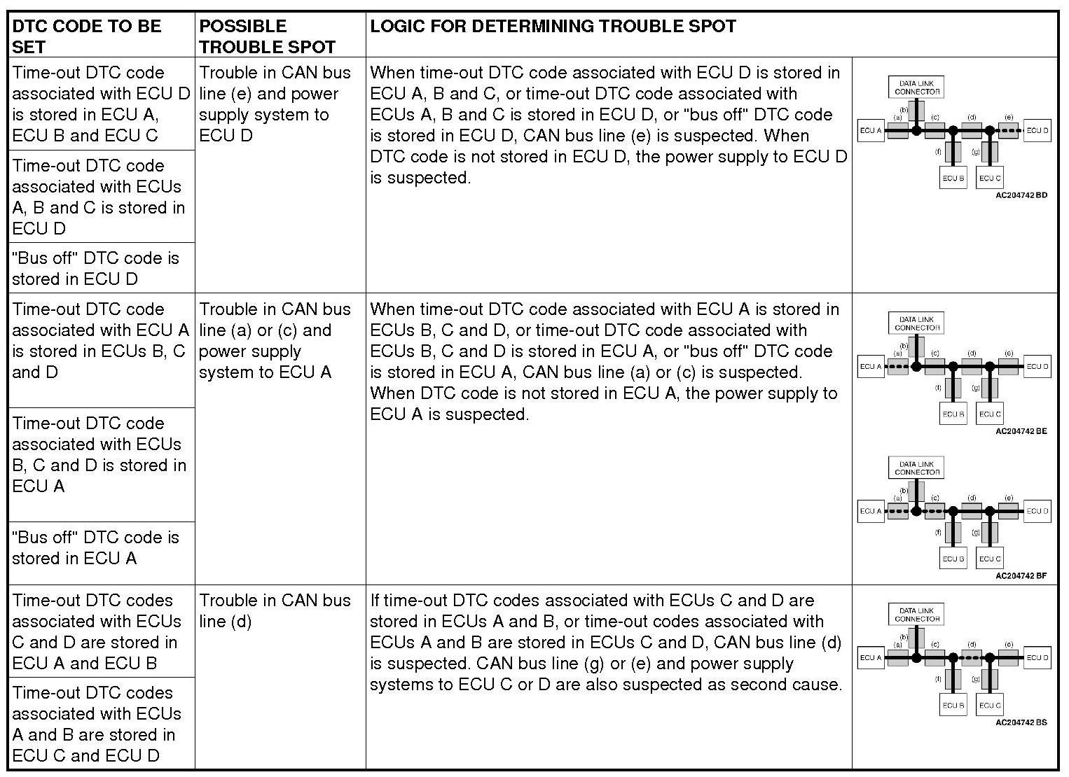 Time-out DTC codes are stored in each ECU memory individually. Therefore, it is possible that these DTC codes have not been set simultaneously. If the trouble spot cannot be found when you diagnose by judging from multiple DTC codes, check the communication lines between each ECU.