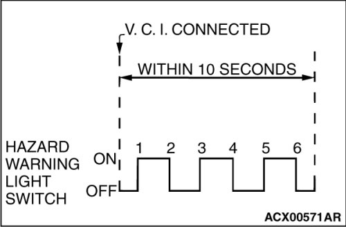 When the hazard warning light switch has been pressed six times, the ETACS-ECU locks and unlocks the doors automatically once. The ETACS-ECU is ready to register an encrypted code.