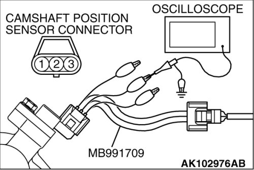 1. Disconnect the camshaft position sensor connector, and connect the test harness special tool (MB991709) between the separated connector (All terminals should be connected).