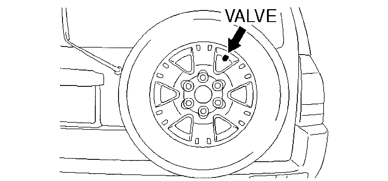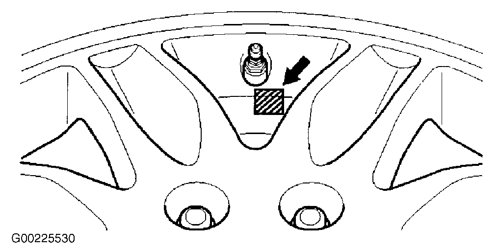On models with a full-sized spare tire, equipped with a TPMS sensor, if the tire is to be re-mounted on a rear hatch carrier, always reposition the valve as shown in Fig 2. If valve is not positioned as shown, the system may determine incorrectly that the spare tire is being used as a road tire.