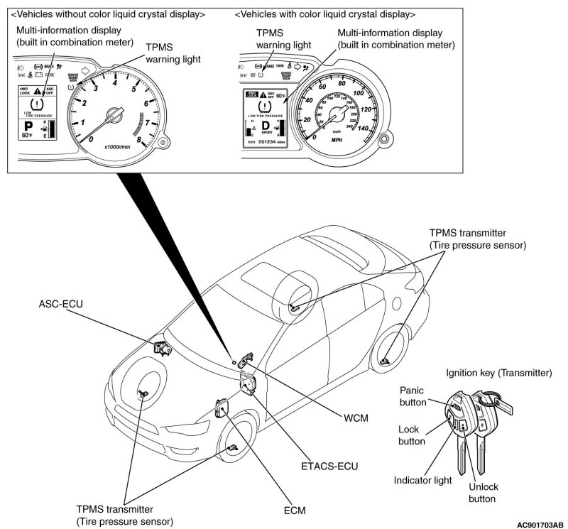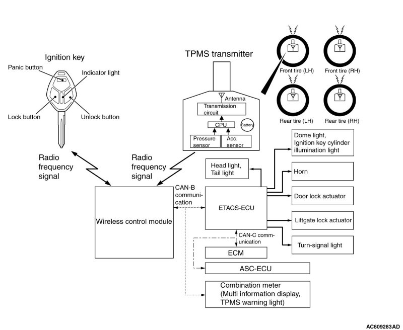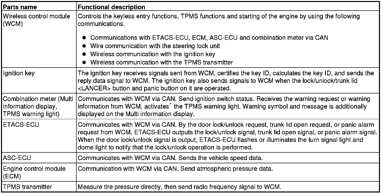 The wireless control module (WCM) is a system that integrates the keyless entry function with which remote operation (opening/closing of all doors, opening of trunk lid [LANCER], liftgate [LANCER SPORTBACK] and warning function to warn a person who intends to damage the vehicle*) can be performed by operating the lock/unlock /trunk lid button or panic button on the ignition key (transmitter). Also, WCM incorporates the immobilizer function, which prohibits the starting of engine using an unauthorized key, and the tire pressure monitoring system (TPMS), which issues a warning to a driver by illuminating or flashing the warning light if an abnormality to the tire pressure or system is detected. WCM has the following features: