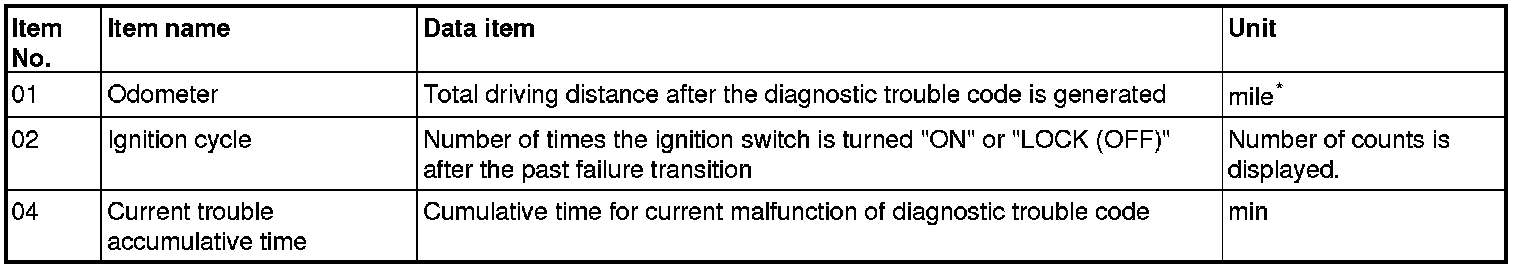 When detecting fault and storing the DTC, the ECU connected to CAN bus line obtains the data before the determination of the DTC and the data when the DTC is determined, and then stores the ECU status of that time. By analyzing each data from scan tool, the troubleshooting can be performed more efficiently. The displayed items are as the table below.