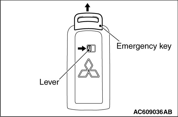 With the lever being pressed in the arrow direction of the illustration, pull out the emergency key from the keyless operation key and remove it.