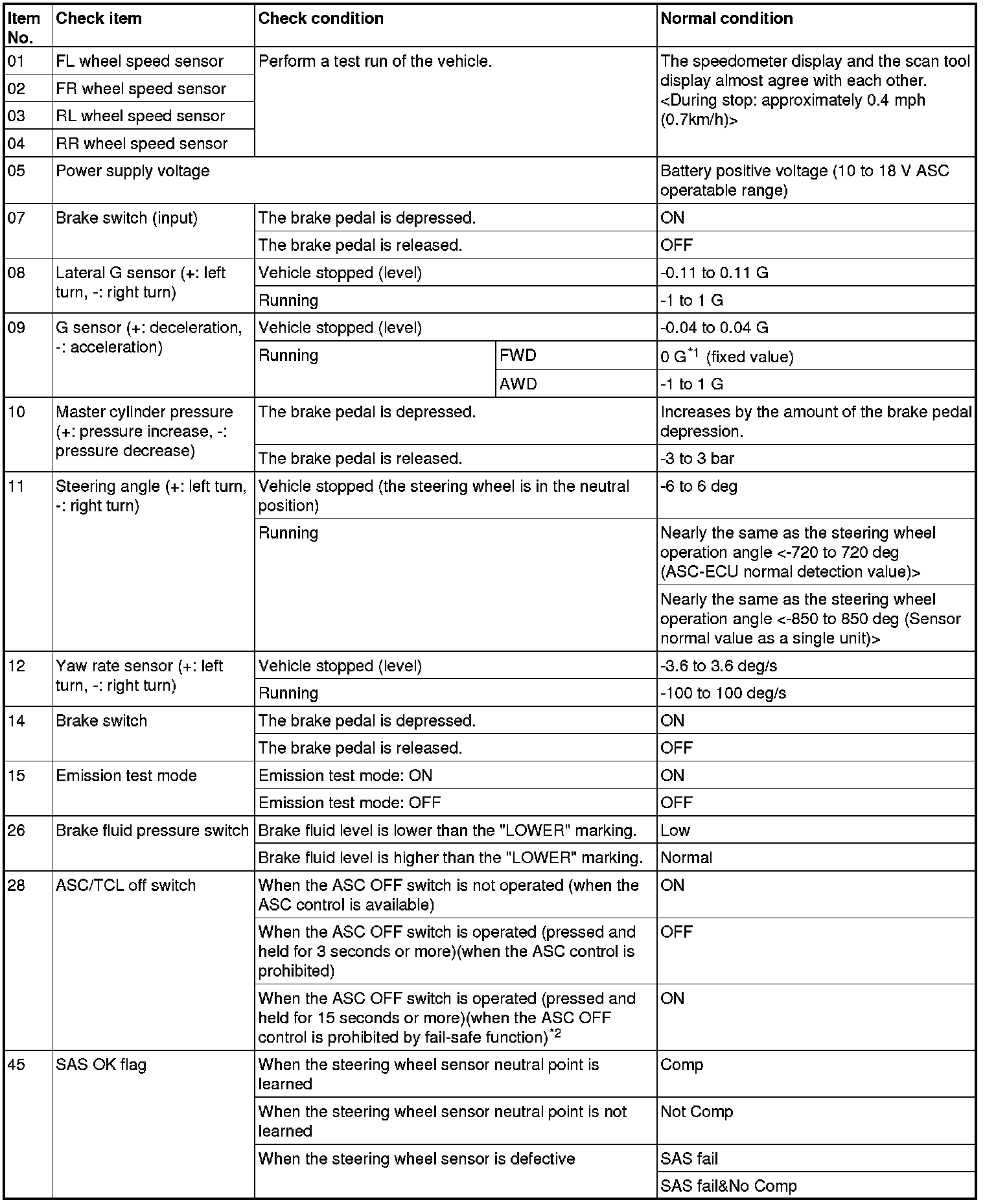 Home >> Mitsubishi >> 2012 >> Lancer AWD L4-2.4L (4B12) >> Repair and Diagnosis >> Brakes and Traction Control >> Antilock Brakes / Traction Control Systems >> Testing and Inspection >> Scan Tool Testing and Procedures >> Active Stability Control System (ASC) >> Data List Reference Table