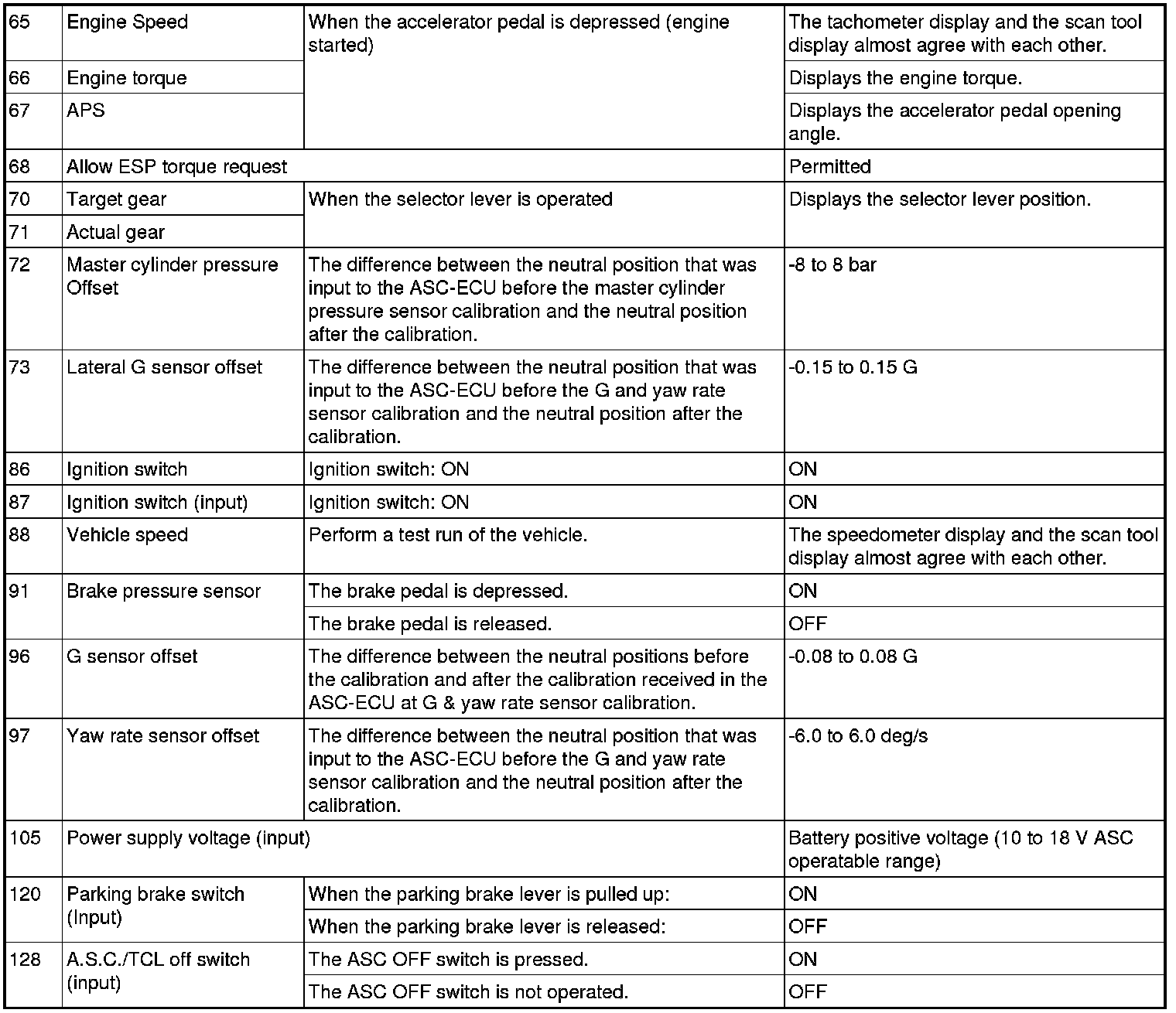 The following items can be read by the scan tool from the ASC-ECU input data.
