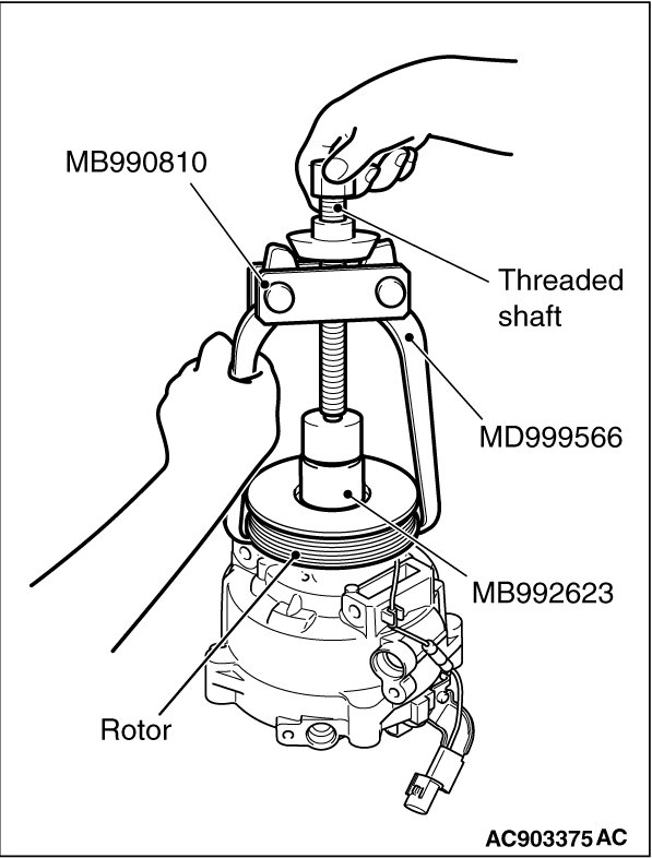 - If the threaded shaft of side bearing puller (MB990810) is turned than necessary, the rotor may be distorted. Therefore, turn the threaded shaft lightly only by hand without using any tools.