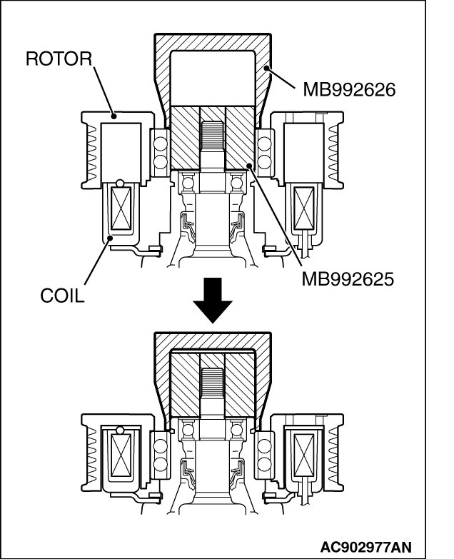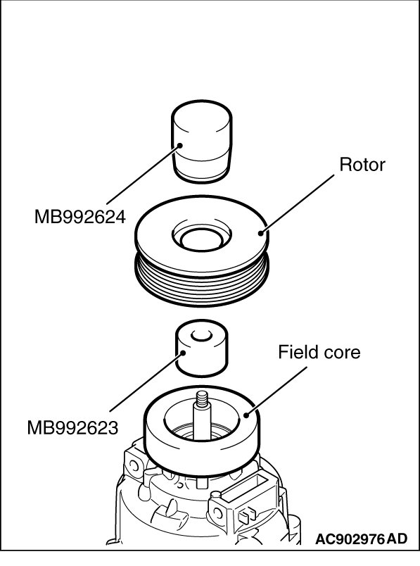 Rotor can be removed by hand, but if it is difficult to remove it, use the guide (MB992623) and the side bearing puller (MB990810) as shown.