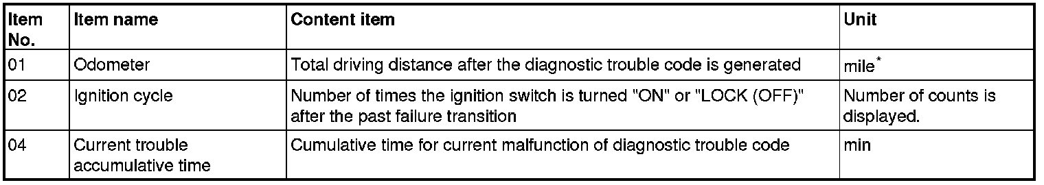 When detecting fault and storing the DTC, the ECU connected to CAN bus line obtains the data before the determination of the DTC and the data when the DTC is determined, and then stores the ECU status of that time. By analyzing the data from scan tool, the troubleshooting can be performed more efficiently. The displayed items are as shown in the table below.