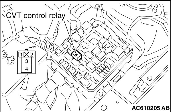 Home >> Mitsubishi >> 2012 >> Lancer AWD L4-2.4L (4B12) >> Repair and Diagnosis >> Transmission and Drivetrain >> Continuously Variable Transmission/Transaxle >> Transmission Control System Relay >> Testing and Inspection