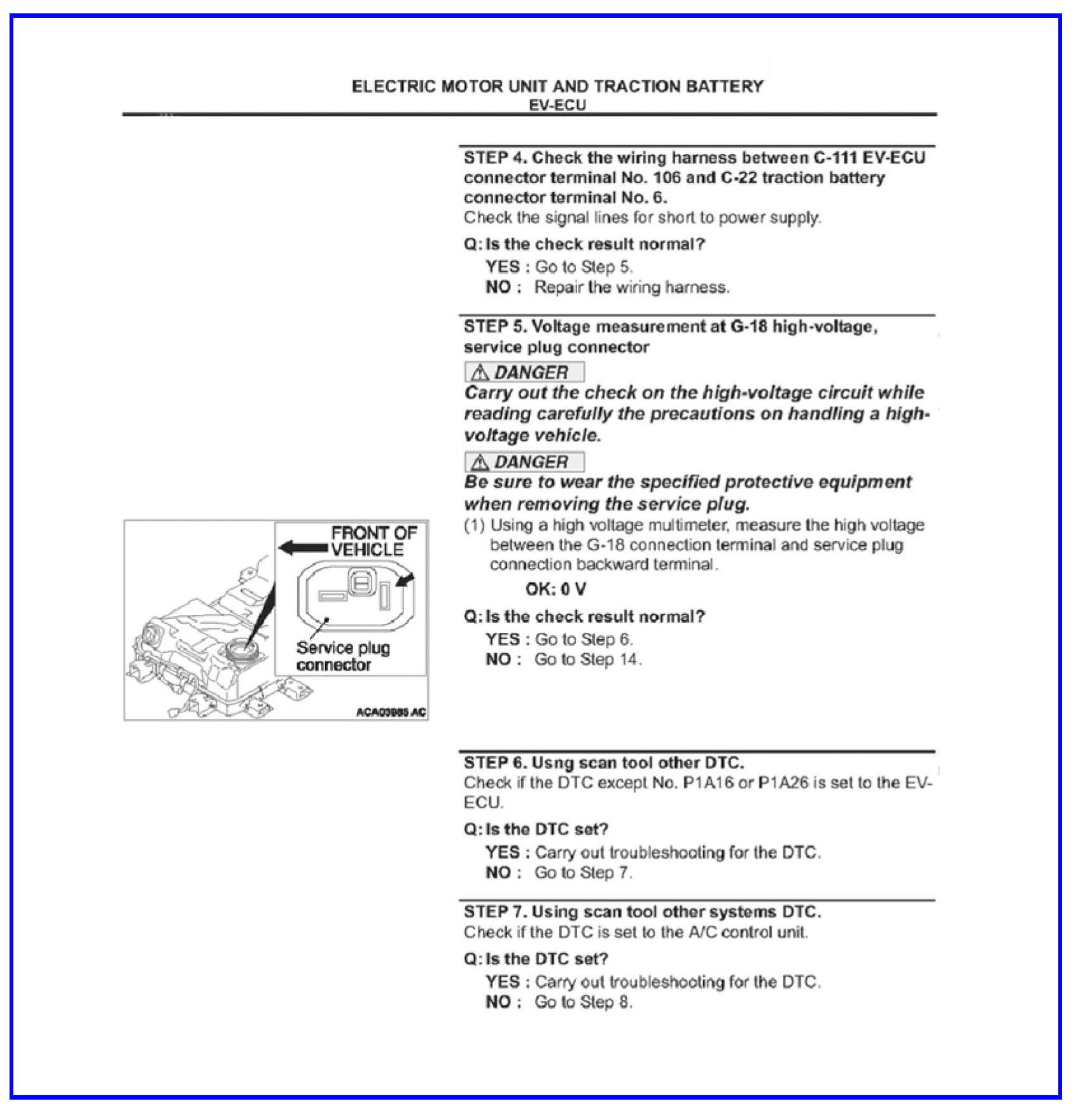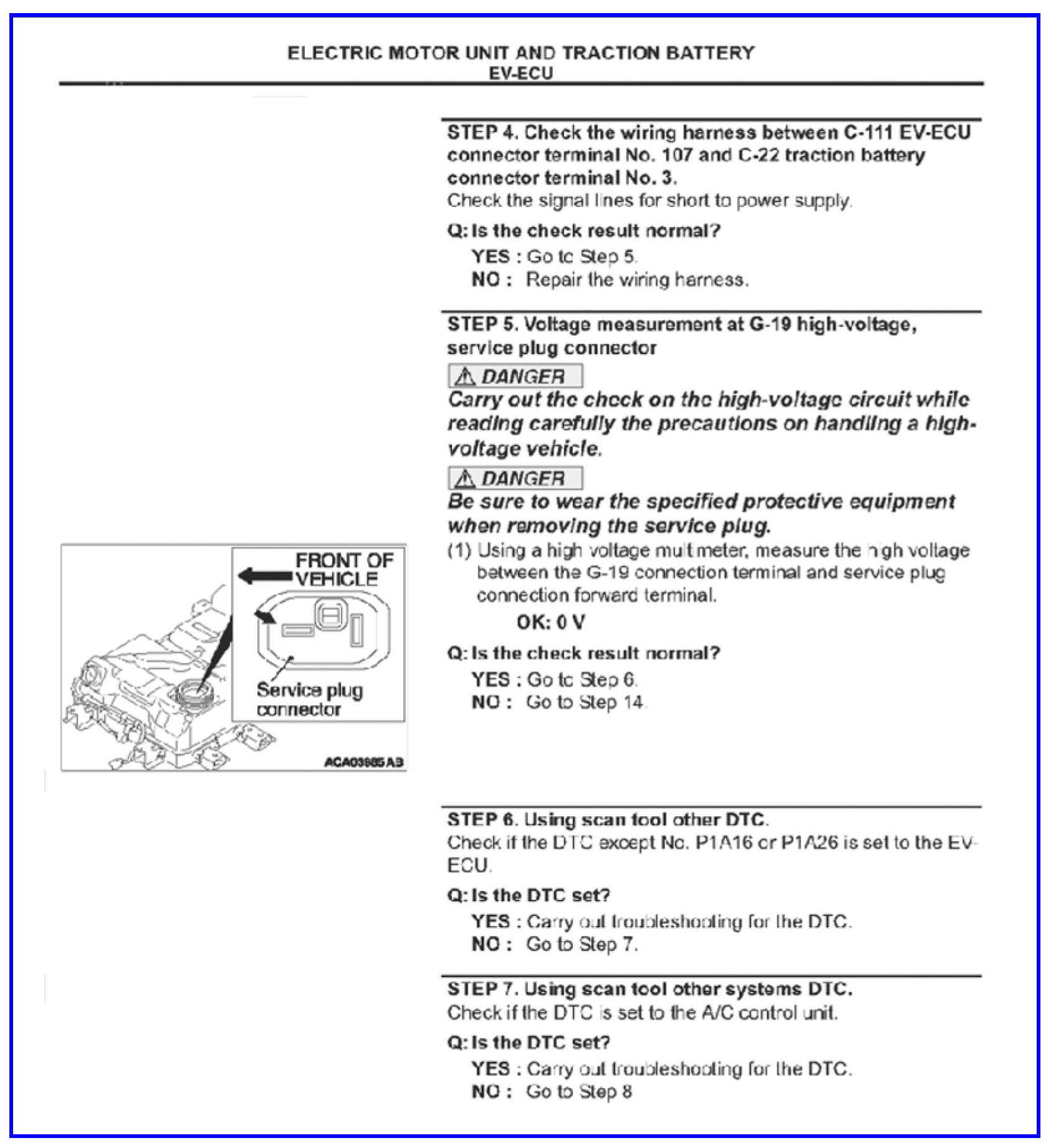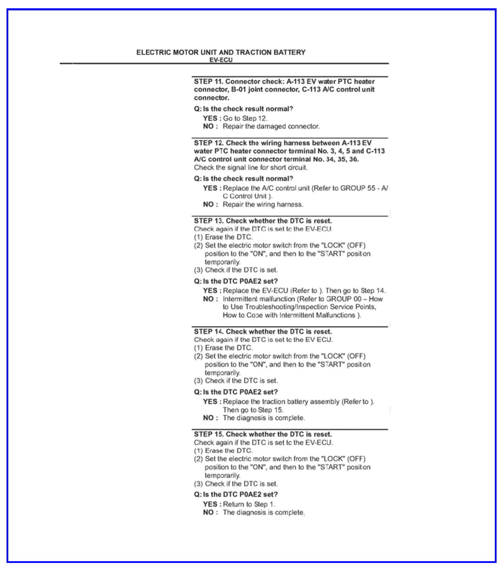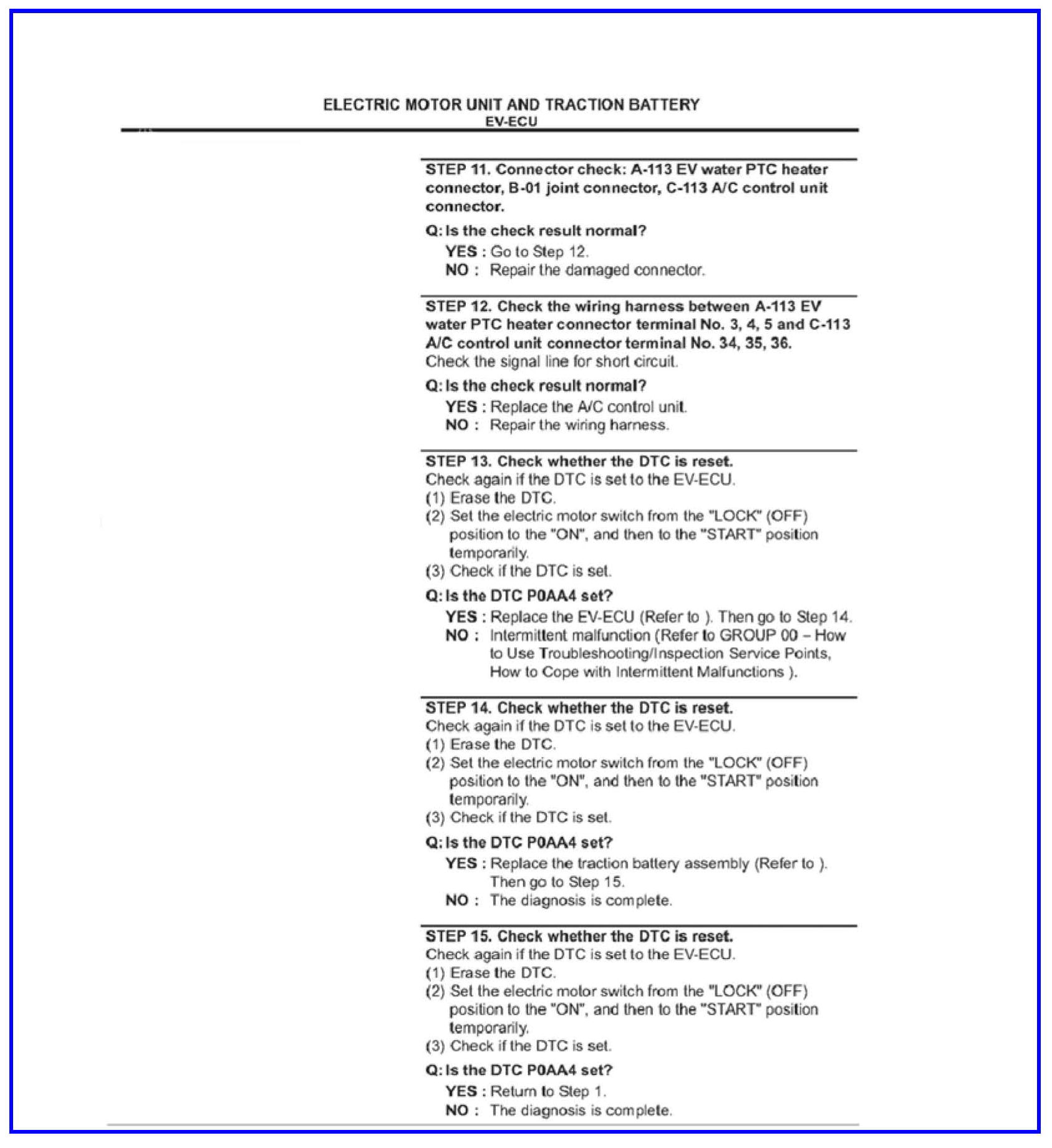 This TSB provides revised trouble shooting procedures for EV-ECU diagnostic codes P0AA1, P0AA4, P0AE2, P1A15, P1A16, P1A17, P1A26, and P1AF2.
