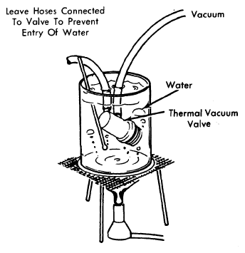 Drain engine coolant and remove thermal vacuum valve from engine. Submerge valve in a container of water. See Fig 1. Apply vacuum to top port of valve and check that valve opens and closes according to water temperature specified in THERMAL VACUUM VALVE TEST SPECIFICATIONS table. If not, replace thermal vacuum valve.