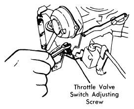 - Throttle valve switch should turn on when engine speed reaches 950-1350 RPM. Slowly decrease engine speed and note RPM at which throttle turns off. Throttle switch should turn off at 800-1200 RPM. If not, adjust switch until it turns on/off at specified RPM. See Fig 2.