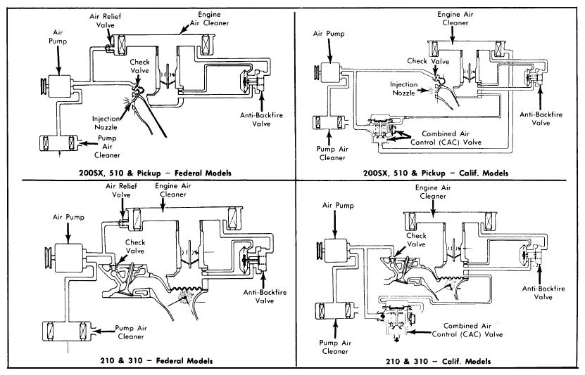 For 1974-78 models, see AIR INJECTION SYSTEMS article In this section. A pulse-air type air infection system is used on 1979 5-speed transmission equipped 210 Hatchbacks. For information on this system see DATSUN AIR INDUCTION SYSTEM article in this section.