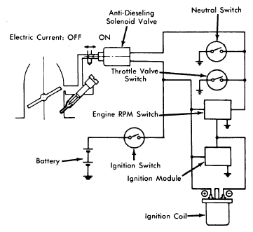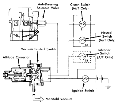 On Pickups, when intake manifold vacuum exceeds a pre-determined level deceleration, the fuel shut-off vacuum switch sends a signal to the anti-dieseling solenoid valve, shutting off fuel flow. See Figure. Whenever manifold vacuum is below this pre-determined level, the system is inoperative. The system is also controlled by the clutch switch and gear position switches (Neutral switch and inhibitor switch) so that system can be deactivated, even though vacuum is above the pre-determined level.