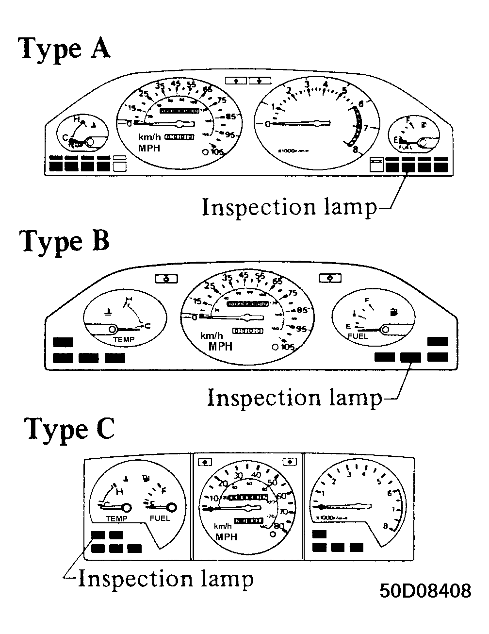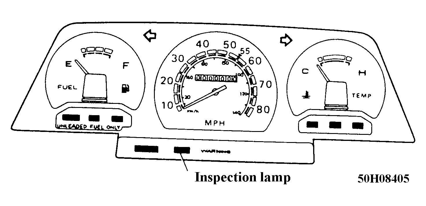 2. If bulb is not lit, replace bulb. If lit, start engine and warm to operating temperature. After warming up engine, let it run at 2000 RPM for about 5 minutes. Recheck inspection lamp. If off, go to step 5). If on, go to next step.